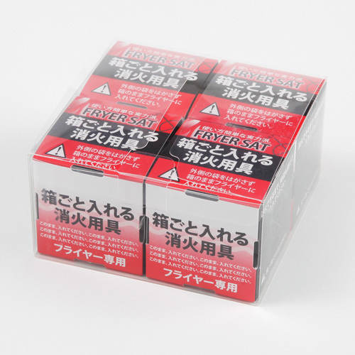 - 揚げ物油火災のために特別調合された消火薬剤入りフライヤーサット1セット(4個)で油量12Lまでの揚げ物油火災の初期消火が可能です。